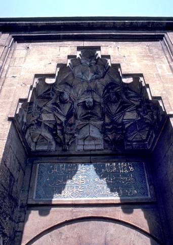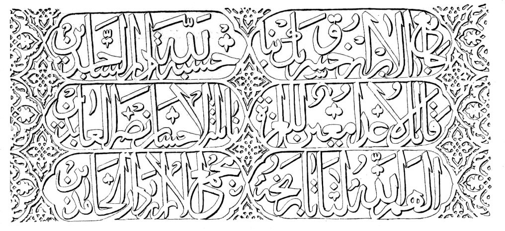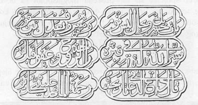 Above the main Masjid entrance we can see there is a stone tablet, 120 cm X 60 cm in size, on which verses in Arabic language are carved. The inscription is placed into six elliptical spaces edged on its sides and through the middle with arabesques. The inscription text is partly vocalised. The inscription surface is blue and the letters are gold plated.