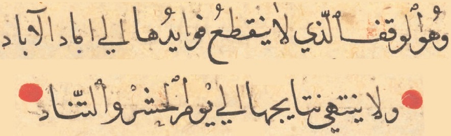 "Every wise and rational man will come to understand that This World is transient and an abode of boredom and misfortunes. This World is neither a house nor a dwelling place, it is but a passage through which one enters the house of salvation or Hell, and wise is he who is not deceived by This World; who does not believe in it; who does not look upon it with amorous eyes and thus allows himself to be governed by It. Fortunate is he who learns from his example and applies it the next day and who, while waiting for death, errs not in his work. Good deeds chase away evil and the best of the good deeds is a charity, and the most exalted act of charity is that which lasts forever, and from all the charitable deeds the best is that which forever repeats itself. It is obvious that from all the lasting charitable deeds the most enduring is Waqf. For as long as This World is in existence the benefit of Waqf will not cease nor will it stop to function until the Day of Judgment."
